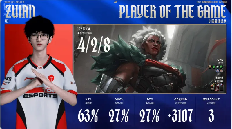 虎扑04月25日讯 ZUIAN狼母打出4/2/8战绩,拿到TES对阵NIP首局比赛MVP